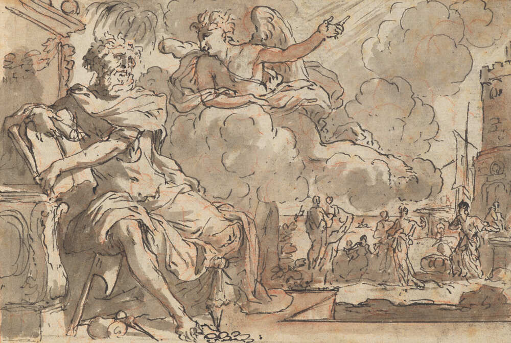 Jan Goeree maakte de tekening op de achterzijde van nagenoeg een gehele gravure, wat hij vaker deed. Deze gravure, gezien formaat en voorstelling bedoeld voor dezelfde serie als de tekening, laat de apostel Petrus zien, met zijn attributen: een sleutel, een boek, een haan en vissen. ( Ingrid Oud)