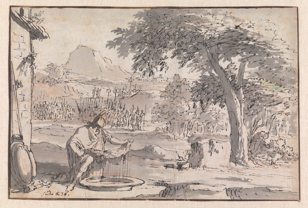 Gideon had God om een teken verzocht, want hij wilde zeker zijn van de hem door God opgelegde taak Isra‰l te verlossen. Inderdaad geschiedde de eerste nacht het wonder: een wollen vachtje was nat door de dauw, terwijl de grond droog bleef. De voorstelling laat zien hoe Gideon het natte vlies uitwringt boven een schaal. De volgende nacht gebeurde het omgekeerde: het vachtje bleef droog en de grond was nat (Richteren 6:36-40).