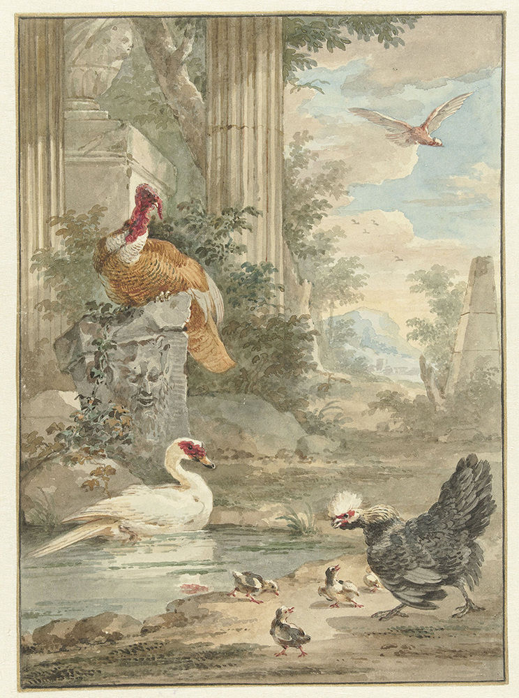 - Kalkoen en andere vogels bij klassieke ruïnes in een park, 1756 - 1761