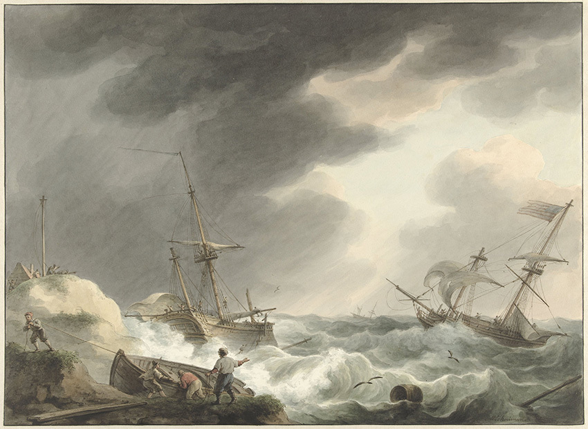 - Schipbreuk van twee schepen, waarvan een onder Amerikaanse vlag, op een duinkust, 1780 - 1848