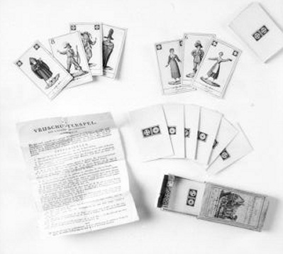 Compleet spel van 24 kaarten, 6 zogenaamde houten pachterstenen, 1 papier met spelregels en het bijbehorende doosje. Op bovenzijde doosje een opgeplakte kaart waarop een afbeelding van 5 personen bij een huis en de tekst: Het VRIJSCHUTTERSPEL met 24 Kaarten en 8 Steenen. Op 7 van de 24 kaarten zijn personen uit de opera Der Freischütz afgebeeld. Op de overige kaarten zijn kleine afbeeldingen van de puntencombinaties van dobbelstenen geplakt. De 6 zogenaamde pachterstenen vertonen ieder aan één zijde verschillende punten: 1 t/m 6 (De overige zijden zijn blanco). Het spel heeft betrekking op de door Carl Maria von Weber (1786-1826) in 1820 gecomponeerde opera Der Freischütz die in 1821 in Berlijn in première ging.