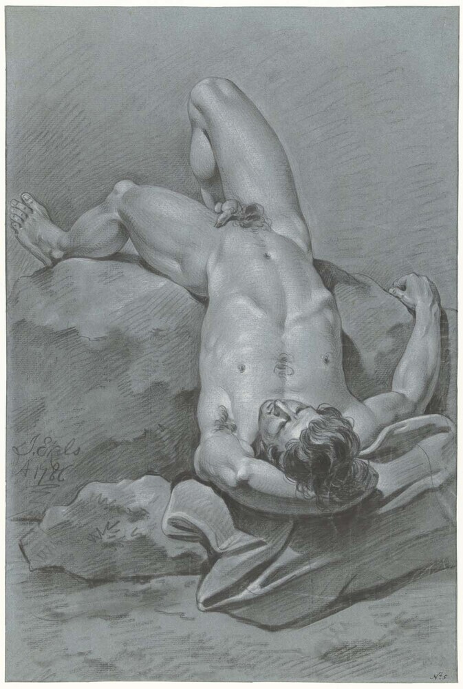 - Studie van mannelijk naakt, achterover liggend op de rug, 1786