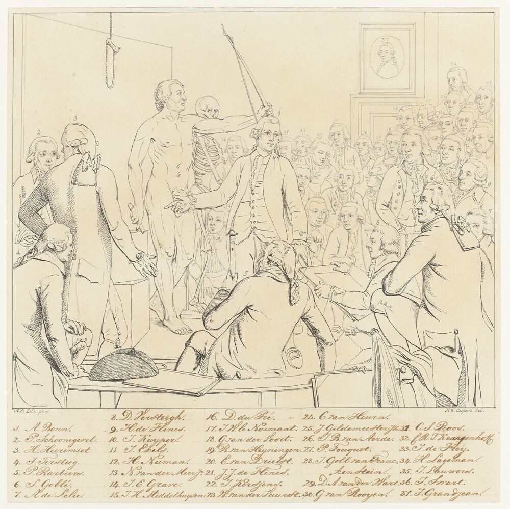 - Omtrektekening met de identificatie van de portretten op het schilderij Professor Andreas Bonn opent de tekenzaal van de Maatschappij Felix Meritis, 1780 - 1829