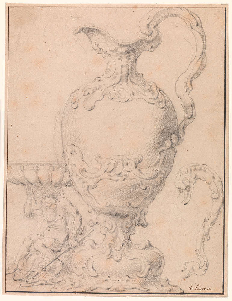 Deze tekening is in 1940 door het museum aangekocht als een werk van Johannes Lutma de Oude, zijn naam staat ook rechtsonder op de tekening vermeld. Echter is de tekening vervaardigd met zwart krijt en is de omlijning tezamen met de naam vervaardigd in pen. Hierdoor is aan te nemen dat de omlijning en de naam in een tweede campaign zijn aangebracht en dus van een latere datum zijn. In het proefschrift van A. von Graevenitz in 1973 kon zij aantonen dat het opschrift ‘J. Lútma’ ten onrechte aangebracht is. De tekening is namelijk een voorstudie geweest voor een blad uit een reeks ornamentprenten die onder de titel ‘Verscheyde constige vindingen om in gout, silver, hout en steen te wercken. Dienstichden silversmeden, beelthouwers en schilders naar d’inventien van Gerbrant vanden Eeckenhout, I. Lutma, A. en P. van Vianen en andere constige meesters’ in Amsterdam werden gedrukt.
