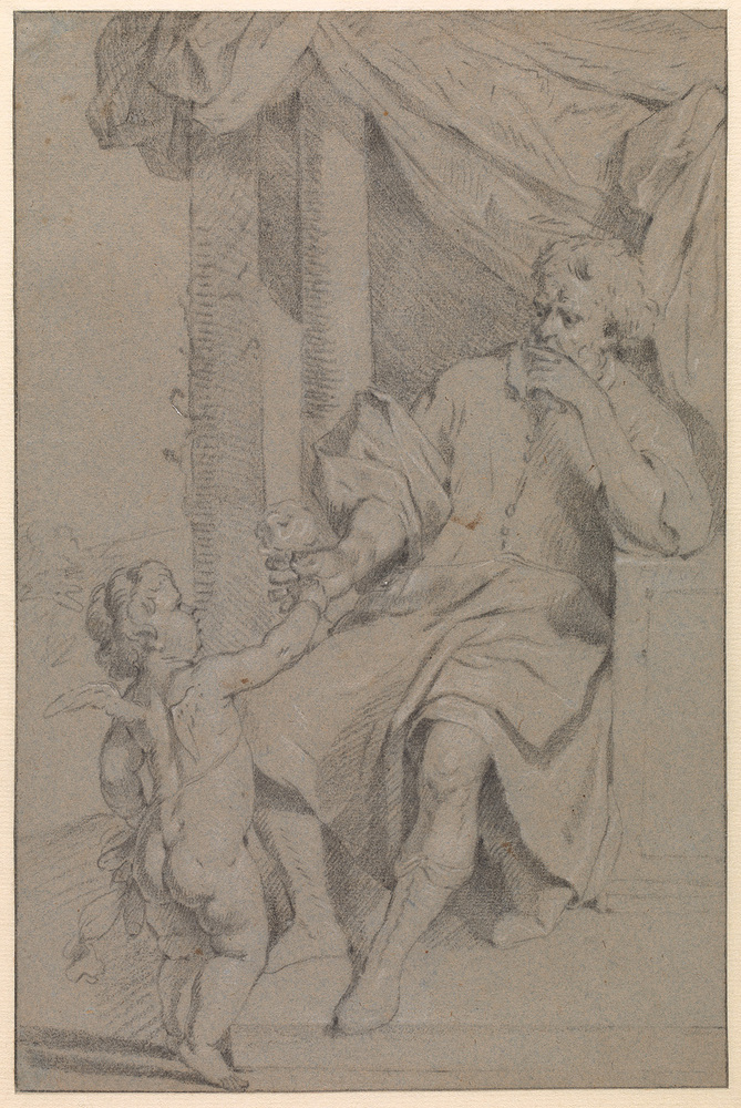 Catalogus van eene fraaije verzameling zoo gekouleurde als ongekouleurde teekeningen … naagelaten door den kunstlievenden heer Hendrik Verdonk Rotterdam (Gebrs. Van Ryp) 30 september 1811, p. 55, nr. 38: ' Een Oud Man, aan wien door een Cupido eene Bloem aangeboden word. Op blaauw Papier met zwart en wit kryt, door G: Flink'; Cat. Dessins anciens et modernes … collection de m. m. L:X: Lannoy (e.a.) Amsterdam (R.W.P : de Vries) 19-28 mei 1925, p. 18, nr. 241: 'G. Flinck. Homme assis sous une draperie; un Cupidon lui présente une rose. Pierre noire sur papier bleu. - Haut. 30, larg. 19.6 c.M.; Veiling C.V. de Lancey a Rome (e.a.), Amsterdam (R.W.P. de Vries), 20-22 juli 1926, p. 5, nr. 55 : 'G. Flinck. Homme assis sous une draperie; un cupidon lui présente une rose. Pierre noire sur papier bleu.- Haut. 30, larg. 19.6 c.M.' (in één lot met TA 18006); aankoop 1933.