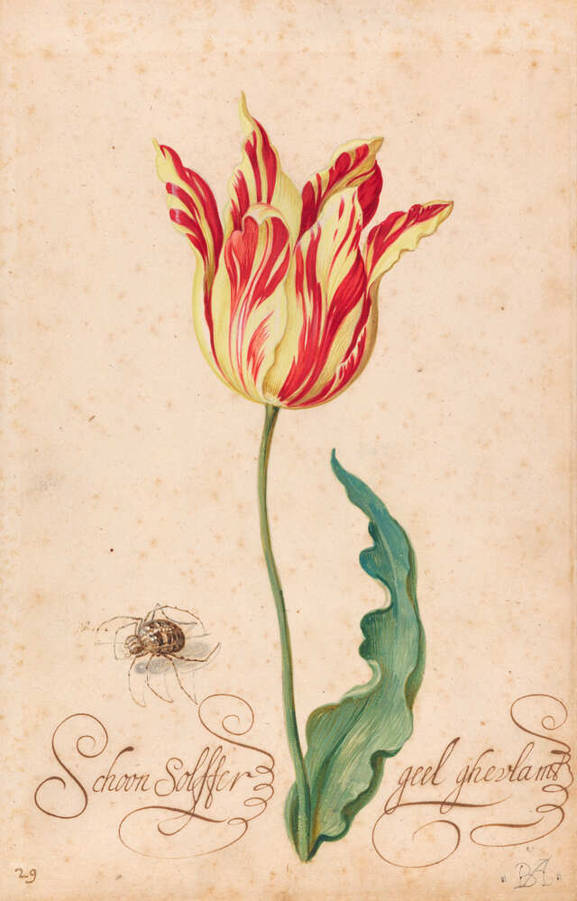 Deze tekening behoort tot een serie van 483 bladen met bloemen en schelpen door de uit Dordrecht afkomstige Bartholomeus Assteyn. Mogelijk waren de tulpentekeningen als catalogus bedoeld. Aangezien de bollen van de kortbloeiende tulpen in de winter werden verhandeld, lieten de handelaren catalogi maken door kunstenaars om hun waar aan te prijzen. De hierbij afgebeelde kruisspin dient meer als voorbeeld van de vaardigheid van de kunstenaar. Deze tulp draagt de naam Schoon Solffer naar de zwavelgele kleur. De gevlamde ofwel bonte tulpen waren de meest waardevolle. ( Bert Vreeken)