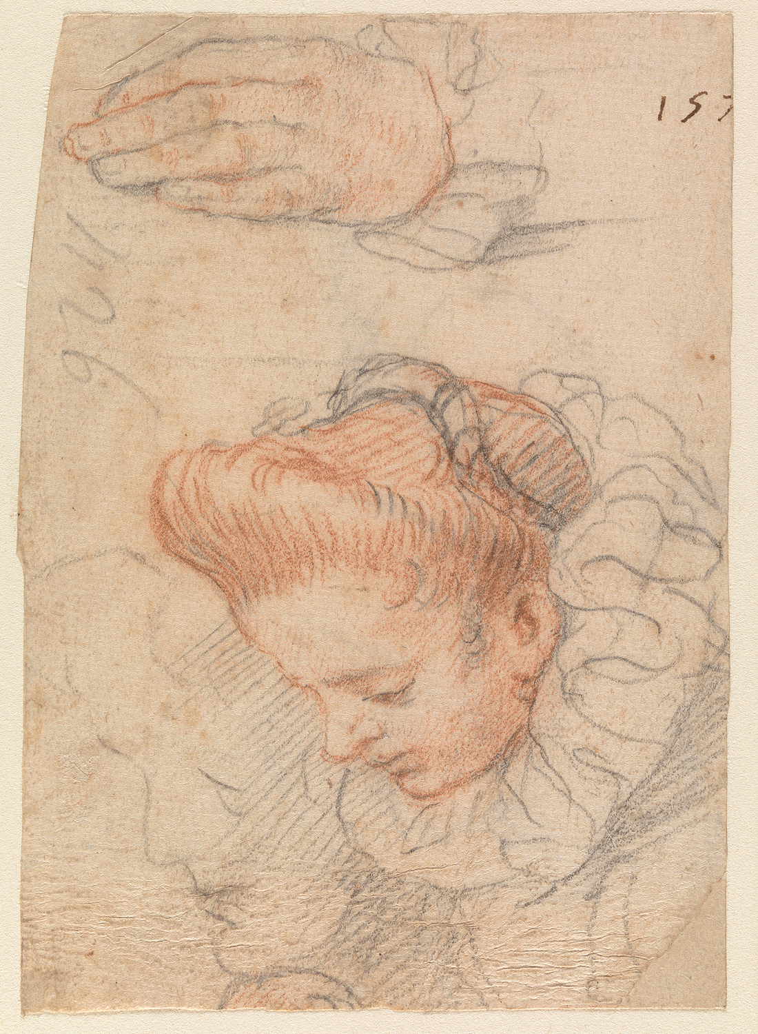 Schetsblad met vrouwenhoofd en hand (recto). Schets van een zittende figuur, naar rechts (verso, in een latere hand)