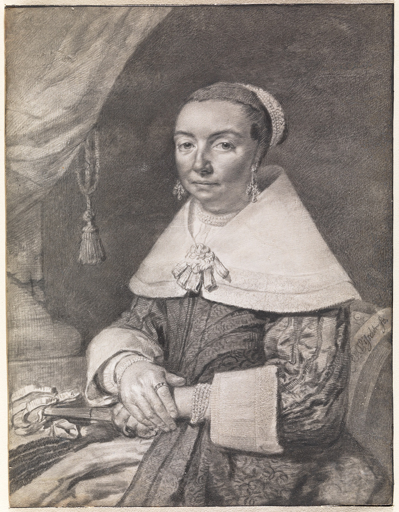 Veiling Reid 1916, p. 15, nr. 150: 'C. de Visscher. Portrait of a Lady, seated with her hands folded, crayon and wash, on vellum, highly finished, signed'; Veiling Wellesley 1920, p. 266, nr. 815 met afb.: 'Cornelis de Visscher. A Lady, name unknown. Seated, three-quarter length, viewed to the left, eyes looking to the right. She is dressed in striped embroidered bodice and overskirt of dark material, with wide cap-like collar edged with lace and secured over the bosom, with a looped rosette, wide cuffs. She wears a triple pearl necklace and bracelets with clusters of pearls in her ears. Her jewelled hands, which rest in her lap, hold a fan with both strings; her hair is brushed back from the forehead and confined in a jewelled cap set well back on her head. A column with a curtain and tassel in the background to the left. The artist's signature is on the back of the chair. Plumbago. Rectangular, 9 by 12 in. On vellum. Signed. A very remarkable Drawing from the Hodges and Carrington Collections'; Aankoop 1936 (van B. Houthakker), (Jaarverslag 1937, p. 16: 'Cornelis Visscher, damesportret (pendant van een mansportret in 's Rijks Prentenkabinet) potlood en krijt op perkament.