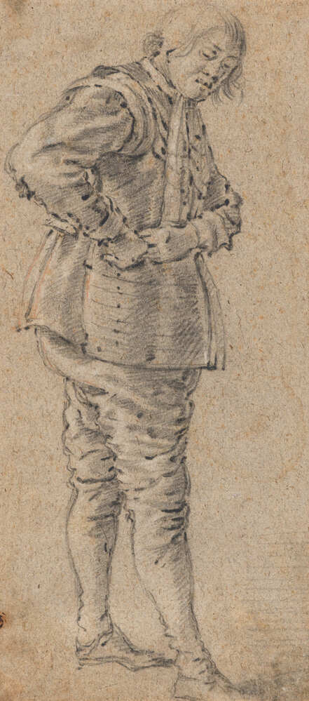 in depot - HerkomstColl. A.W.M. Mensing, veiling Amsterdam (Fr. Muller) 27-29 april 1937, p. 46, nr. 433: 'Jan Martszen de Jong. Guerrier ajustant son uniforme. Pierre noire. -Huat. 28.4, larg. 13 cent, '(f 10,-, aan Altena); Aankoop 1937 (jaarverslag 1938 p. 15).