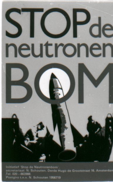 - opschrift voorzijde: STOP de/ neutronen/ BOM : eronder nog veel kleine letters tekst