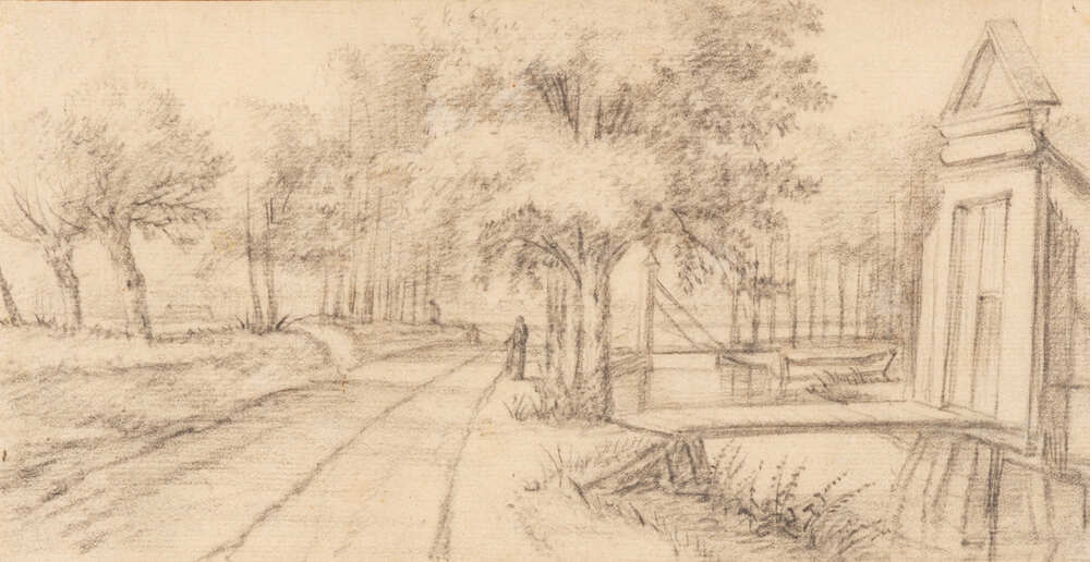 - Een door bomen omzoomde weg langs een watertje, 1686 - 1687