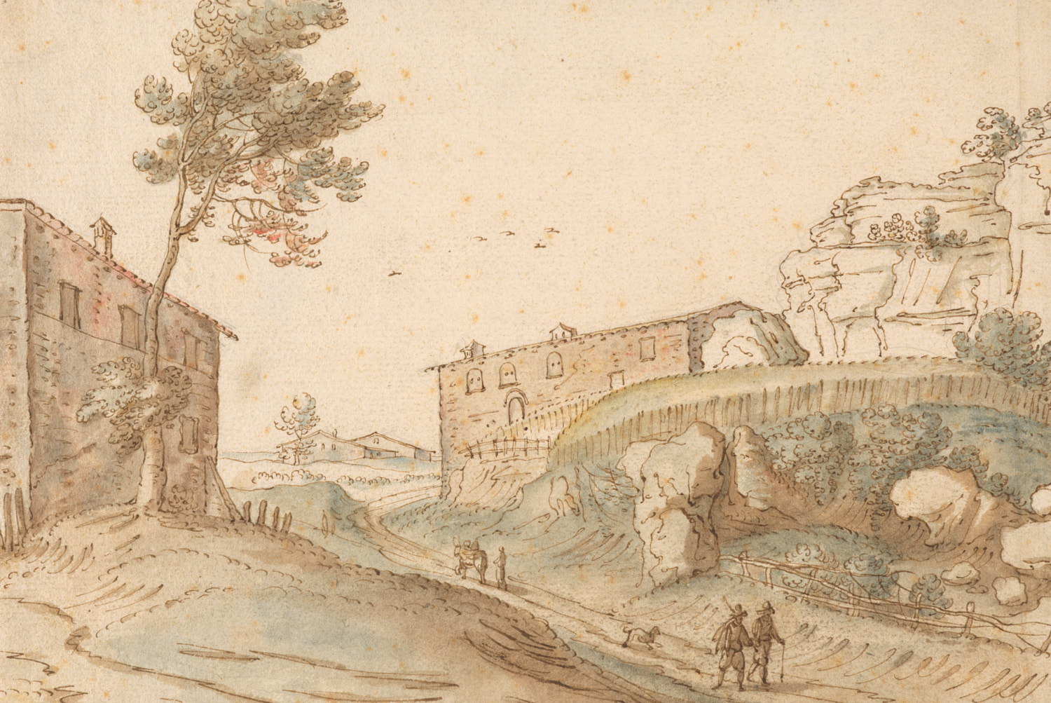 W.E. Drugulin; Coll. K.E. von Liphart, veiling Leipzig (Boerner) 26 april 1898 e.v.d., nr. 674: 'Willem van Nieuwlandt. Landschaft mit Gebäuden, rechts ein hoher Felsen, vorn zwei Wanderer met einem Hund. 18/27. Treffliche Federzeichnung, leicht in Farben.' Coll. R. Ph. Goldschmidt, veiling Frankfurt a.M. (F.A.C. Prestel) 4-5 oktober 1917, nr. 405: 'Willem van Nieuwelandt. Landschaft mit Gebäuden, rechts Weinberg, dahinter ein hoher Felsen, vorn zwei Wanderer mit einem Hunt. Vortfeffliche Sepiazeichnung (Feder), leicht aquarelliert. 18: 27.- Aus den Sammlungen Drugulin und Liphart.' Coll. A.W.M. Mensing, veiling Amsterdam (Fr. Muller/Mensing) 27-29 april 1937, nr. 490:' Guillaume van Nieulandt. Paysage italien, accidenté et rocheaux. Aquartelle, Haut. 18, larg. 26.7 cent (Fl. 110,-); Aankoop 1937, vermeld in het jaarverslag over dat jaar, p. 15 (als W. van Nieuwlandt)