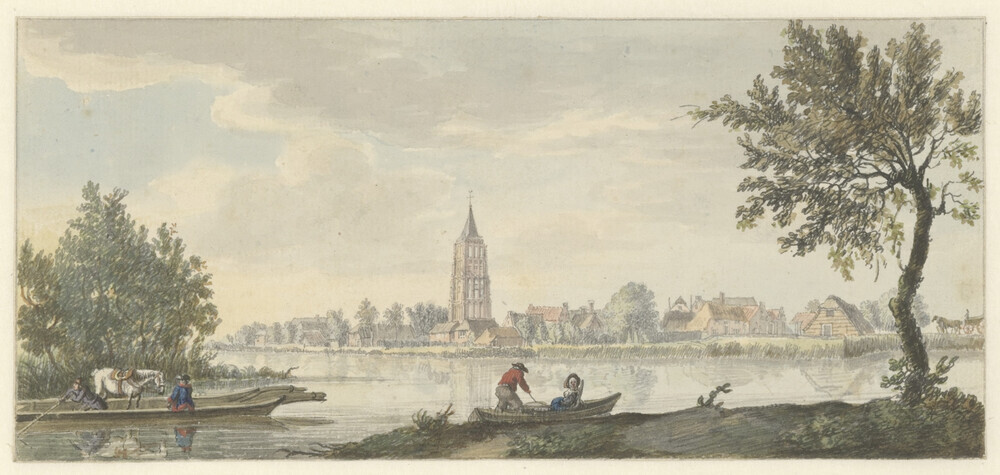 Het Zuid-Hollandse plaatsje Heukelum gelegen aan de Linge is hier gezien vanuit het noorden. Een oversteekveer zorgde voor de verbinding, zoals links op de tekening is te zien. De hoge toren van de middeleeuwse kerk werd in 1829 gesloopt. Heden ten dage zijn slechts het eenbeukige koor met verschillende aanbouwsels over. Jan de Beijer was op 8 augustus 1750 in Heukelum, wat blijkt uit de datering van een ter plekke gemaakte tekening.