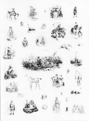 - Studieblad met landschapstudies en historiestudies, enkele paarden etc. in het midden een veldslag, 1844 - 1903
