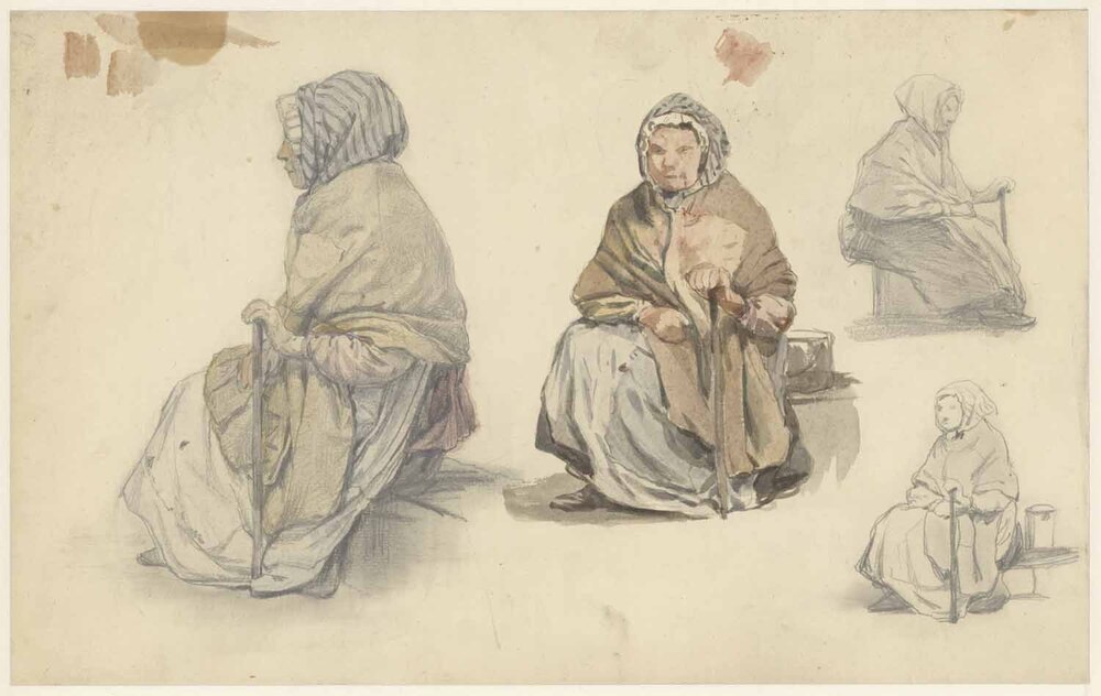 - Studieblad: twee studies van oude vrouw en twee in kleur, 1844 - 1903