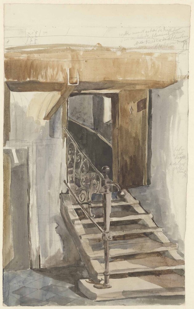 - Een keldertrap. Boerenkamer met waschtobbe (verso), 1844 - 1903