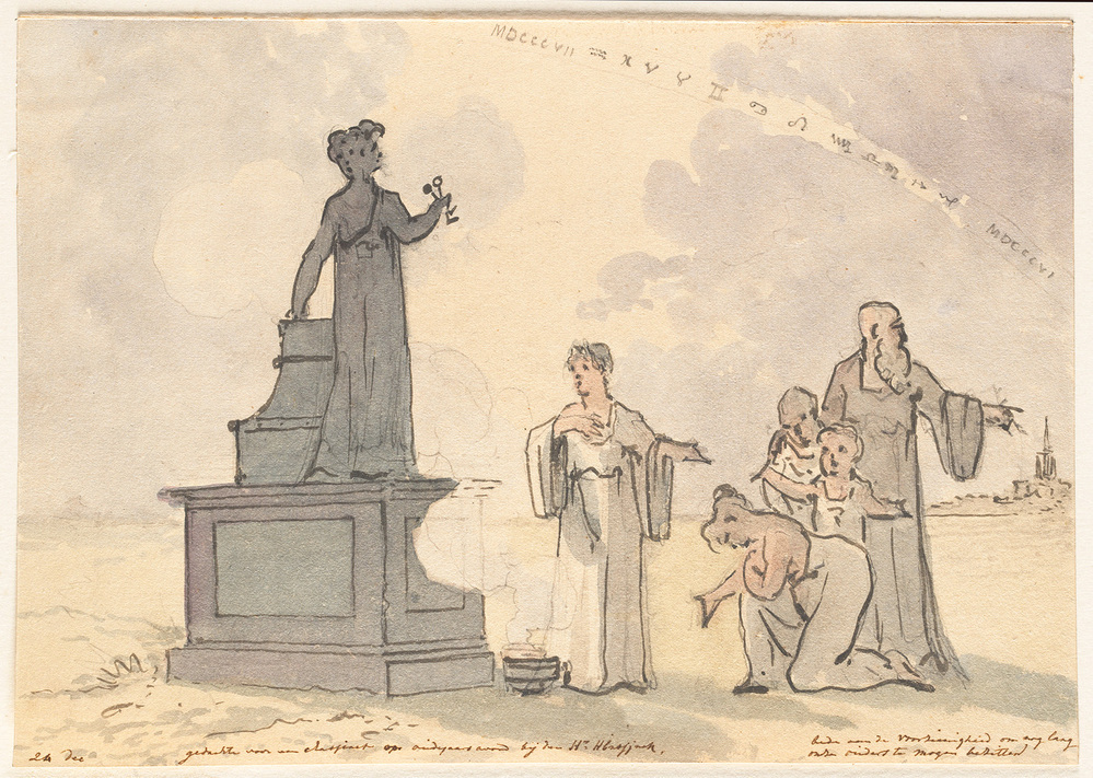 Op dit dagboekblad heeft Christiaan Andriessen (1775-1846) geen scène uit zijn dagelijks leven weergegeven. In plaats daarvan ontwierp hij een allegorische voorstelling. De tekening is, zoals het opschrift ons vertelt, bedoeld voor ‘Den Heer Hartsinck.’ Hiermee wordt Pieter Cornelis Hartsinck (1756-1809) bedoeld, een rijke Amsterdammer met wie de familie Andriessen bevriend was. Zowel Christiaan als zijn vader Jurriaan Andriessen (1742-1819) ontving opdrachten van de familie, maar vader en zoon werden ook uitgenodigd om hun vakantie te besteden in het buitenhuis dat de Hartsincks hadden in Vogelenzang.