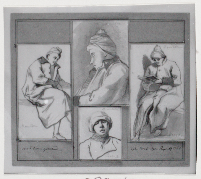 Vier bladen met figuurstudies 'op de Brabandsche Reijs' (recto) Summiere schets van een gezicht (verso van blad 3) Figuurstudie (verso van blad 4), 1765