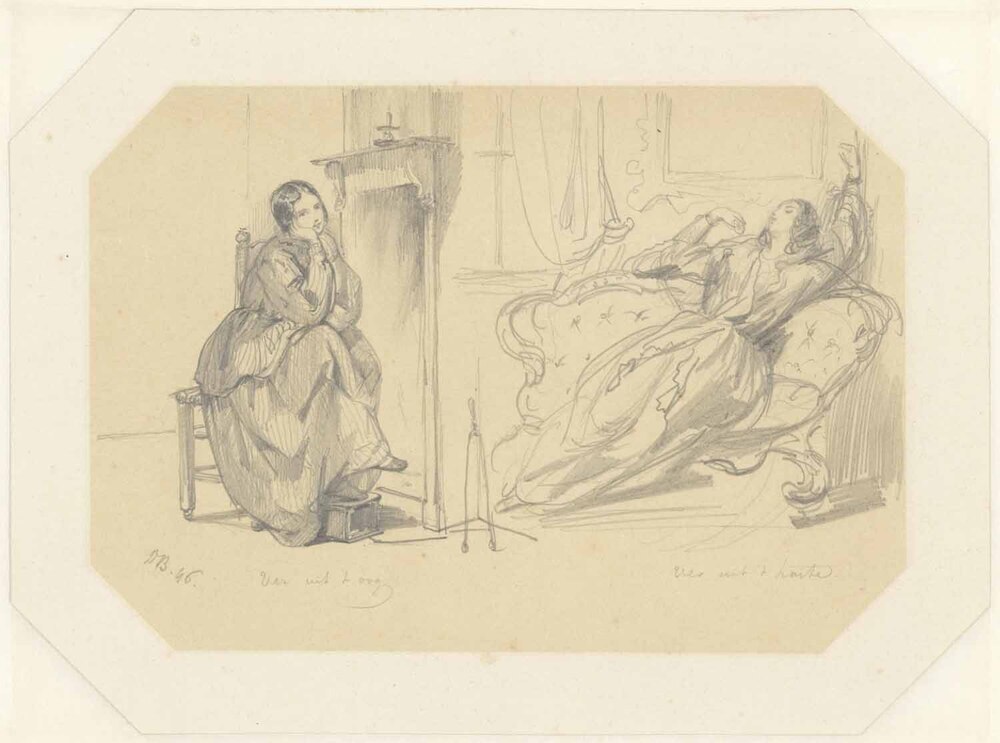 - "Ver uit 't oog, ver uit 't hart" vrouw aan den haard, en vrouw op divan 1846, 1846
