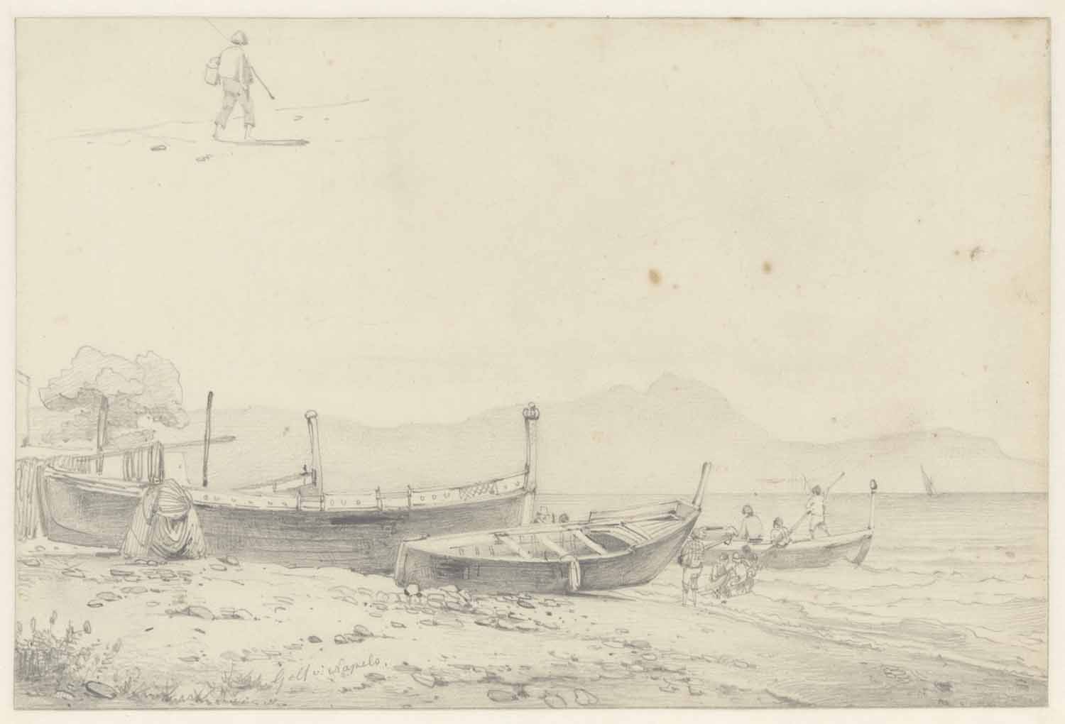 - Booten in de golf van Napels, links boven schets van een visscher. Enkele krabbels v.e. boot (verso), 1844 - 1893