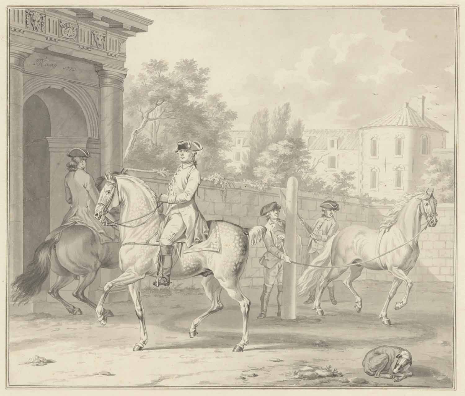 Collectie C. Ploos van Amstel, Veiling Amsterdam, 3 maart 1800 e.v.d., Kunstboek QQ, nr. 33: 'Een Manege van verscheidene cavalleristen, en een paard aan de longe; met O.I. Inkt, door J.P.C. Haag.' (f 13:-:- aan Jozi); Collectie Jacob Helmolt (1747-1808); Aankoop kunsthandel B. Houthakker, Amsterdam, 1936.