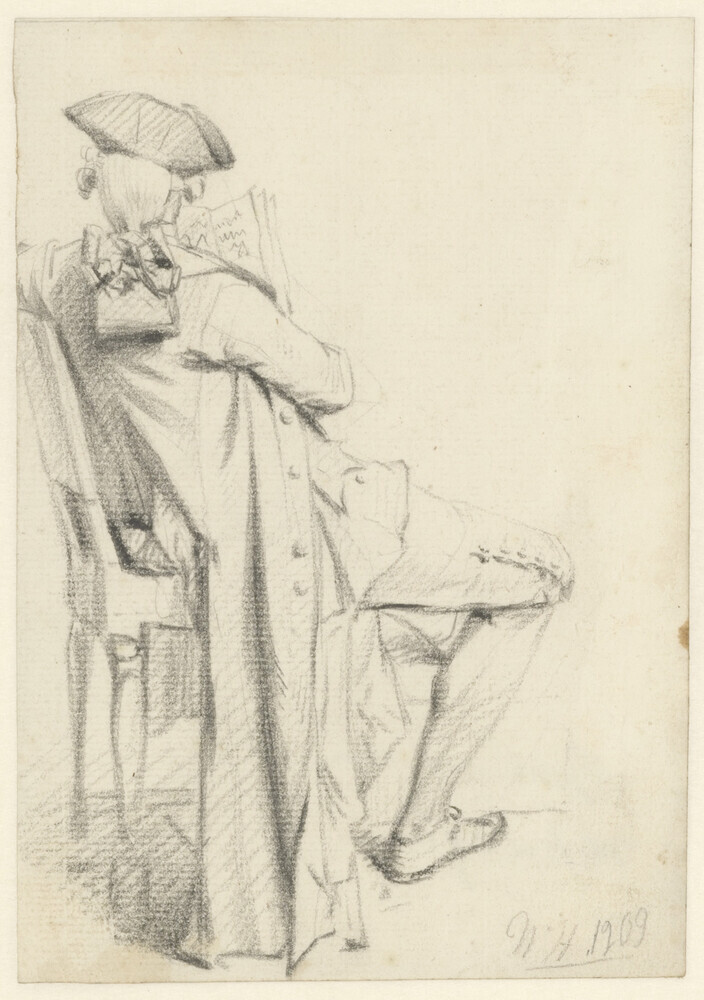 De zittende man met een boek werd aanvankelijk ge‹dentificeerd als de kunstenaar Willem Joseph Laquy, op grond van het achterschrift Getekend na/W.J: Laqui. Wybrand Hendriks heeft hiermee echter bedoeld dat hij de tekening kopieerde naar een thans niet bekende figuurstudie van Laquy.