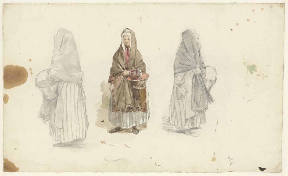 - Drie studies van een vrouw, de middenste in kleur, verso met groentenemmer, 1838 - 1893