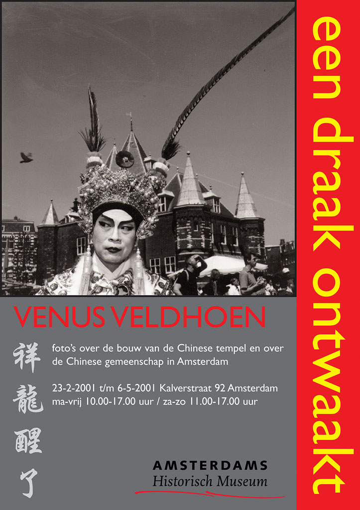 2001, affiche voor tentoonstelling Een draak ontwaakt. Venus Veldhoen, foto's over de bouw van de Chinese tempel en over de Chinese gemeenschap in Amsterdam, 2000 - 2001