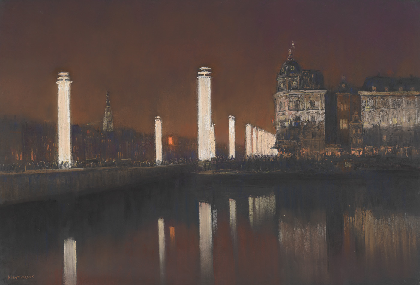 Op de hier afgebeelde pasteltekening zien we een deel van de 68 lichtzuilen van negen meter hoog die het Damrak opsierde en de weerspiegeling ervan in het water van het Open Havenfront. Het Victoria Hotel en de Oude Kerk zijn herkenbare punten die zijn aangelicht. In het schijnsel van het licht is op het stuk van Centraal Station naar Damrak en op de Prins Hendrikkade het gekrioel te zien van de massale stroom van belangstellenden. ( Frans Oehlen)