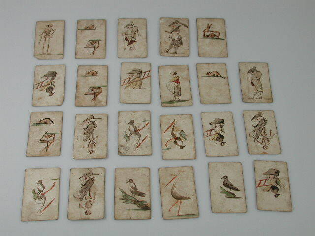 Speelkaarten aan achterzijde voorzien van tekeningen van mensen en dieren.- Trefwoorden