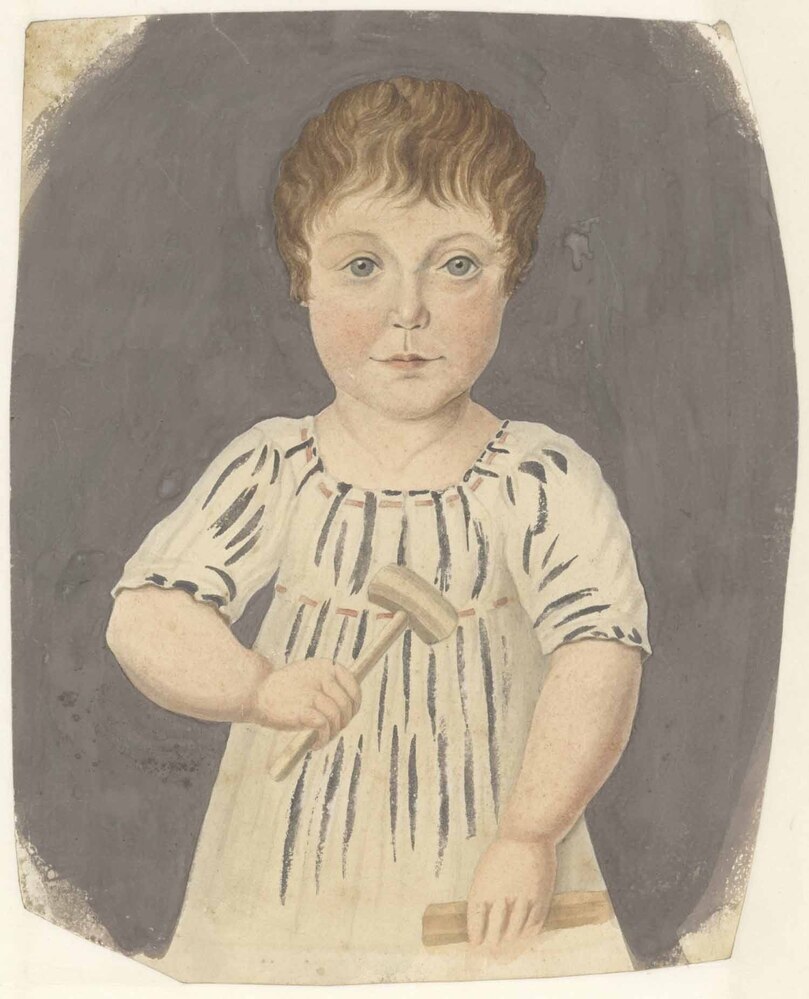 Tegen grijs fond een kind, tot kniehoogte, in verticaal gestreept jurkje met halve mouwtjes. De blik is op de beschouwer gericht. In de linkerhand heeft het een houten hamer, in de rechterhand een stukje hout. empire stijl- Trefwoorden