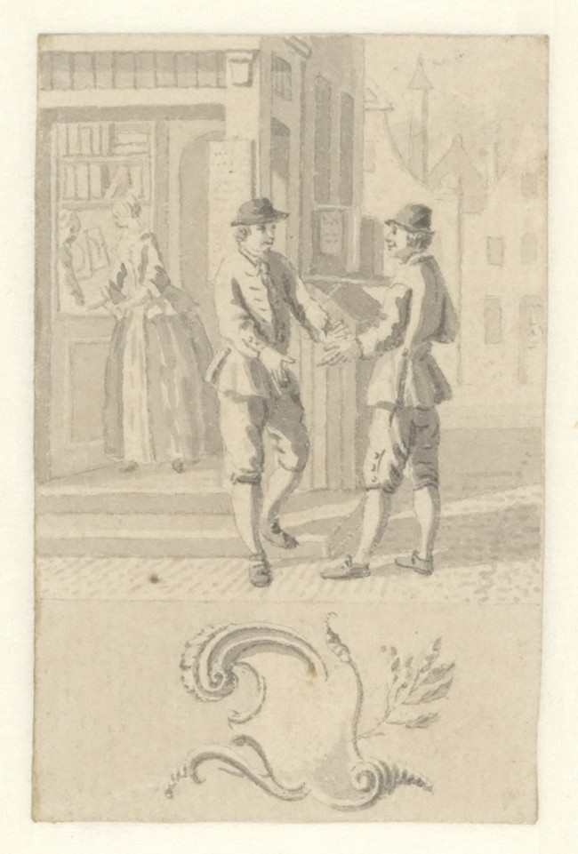 Ontwerpen voor de zestig kaartjes van een loterijspel (Twee mannen in gesprek voor een boekwinkel), 1740 - 1760