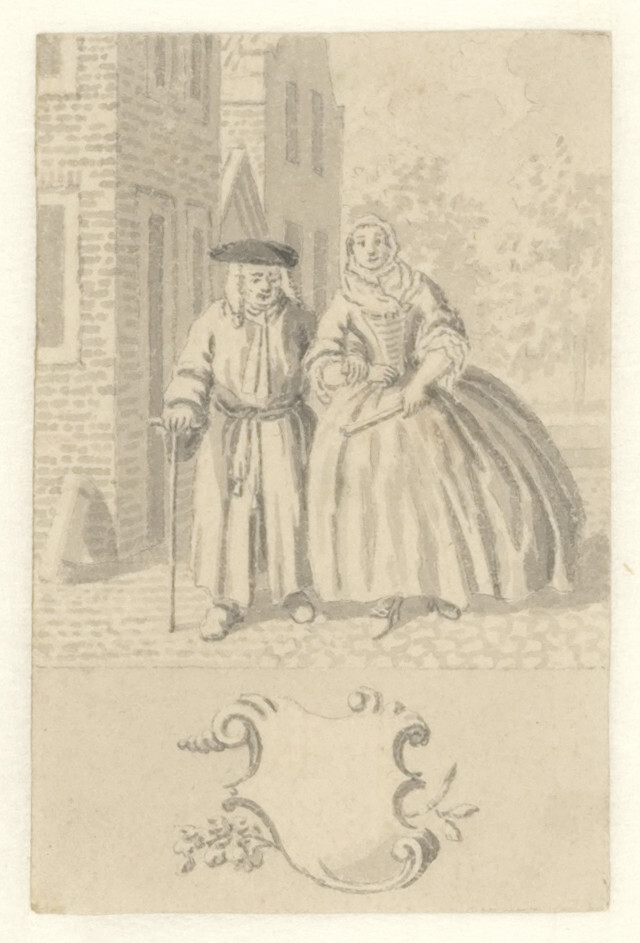 - Ontwerpen voor de zestig kaartjes van een loterijspel (Gearmd lopende oude man en jonge vrouw), 1740 - 1760