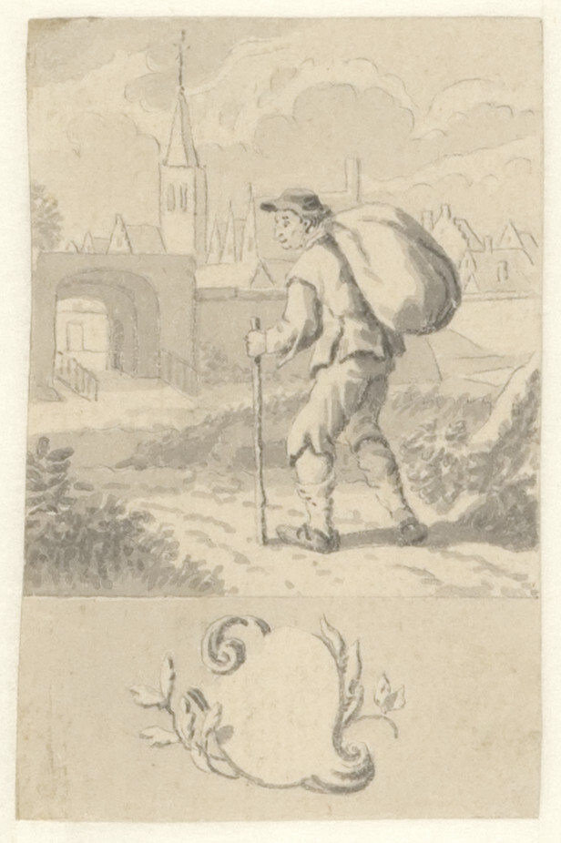 Ontwerpen voor de zestig kaartjes van een loterijspel (man met een wandelstok en een zak op de rug nadert een stad), 1740 - 1760 Amsterdam papier, potlood, waterverf hoogte: 7.5 cm; breedte: 4.9 cm; opschrift verso: 44