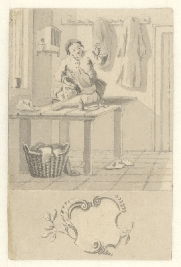 - Ontwerpen voor de zestig kaartjes van een loterijspel (Interieur met kleermaker zittende op een tafel), 1740 - 1760