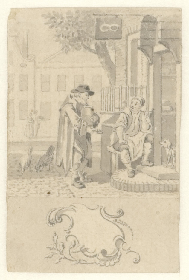 Ontwerpen voor de zestig kaartjes van een loterijspel (Joodse augurkenverkoper in gesprek met een man voor een bakkerswinkel), 1740 - 1760 Amsterdam papier, potlood, waterverf hoogte: 7.5 cm; breedte: 4.9 cm; opschrift verso: 54