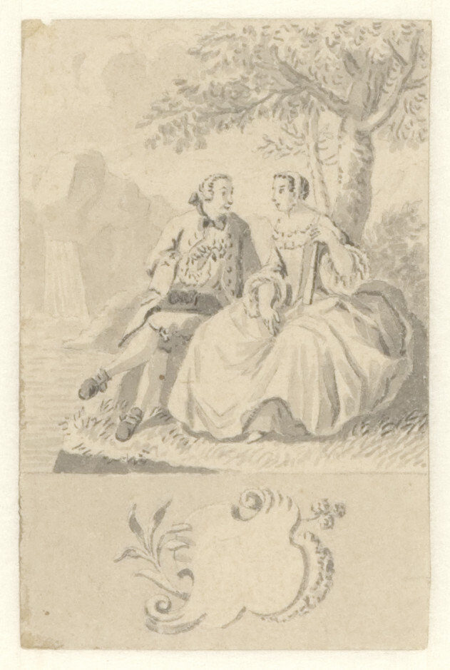 - Ontwerpen voor de zestig kaartjes van een loterijspel (Landschap met zittende man en vrouw in gesprek), 1740 - 1760