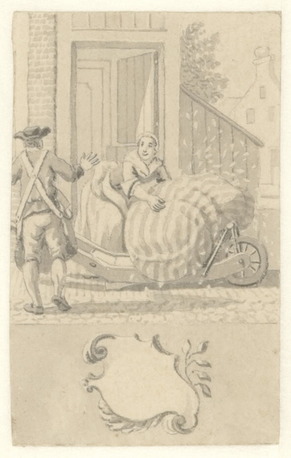 Ontwerpen voor de zestig kaartjes van een loterij spel (Vrouw met een veren bed op een kruiwagen en een kruier voor een huisdeur), 1740 - 1760 Amsterdam papier, potlood, waterverf hoogte: 7.5 cm; breedte: 4.9 cm; opschrift verso: 59