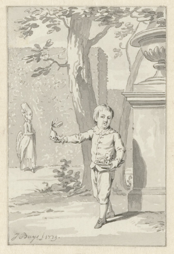 Veiling Cornelis van Stroo, Alkmaar, 29 juli 1811 e.v.d., Kunstboek P: 'Inhoudende 44 stuks Teekeningen, met den Titel; allen met de Pen en O.I. inkt door Jacobus Buys behorende tot de Kindergedichten van J. van Alphen' en 'Ook nog 24 stuks Teekeningen tot onderscheidene Werken behoorende, allen met O.I. inkt door zoo Evengemelde Meester [Jacobus Buys].';Aankoop 1985 (van E.H. Ariëns Kappers, Amsterdam, zogenaamd als afkomstig uit de collectie van Cornelis Schoon (1719-1778), Broek in Waterland, gehuwd met Neeltje Pater)