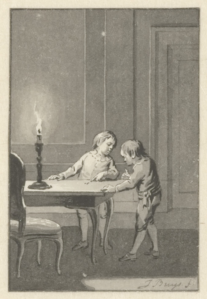Veiling Cornelis van Stroo, Alkmaar, 29 juli 1811 e.v.d., Kunstboek P: 'Inhoudende 44 stuks Teekeningen, met den Titel; allen met de Pen en O.I. inkt door Jacobus Buys behorende tot de Kindergedichten van J. van Alphen' en 'Ook nog 24 stuks Teekeningen tot onderscheidene Werken behoorende, allen met O.I. inkt door zoo Evengemelde Meester [Jacobus Buys].';Aankoop 1985 (van E.H. Ariëns Kappers, Amsterdam, zogenaamd als afkomstig uit de collectie van Cornelis Schoon (1719-1778), Broek in Waterland, gehuwd met Neeltje Pater)