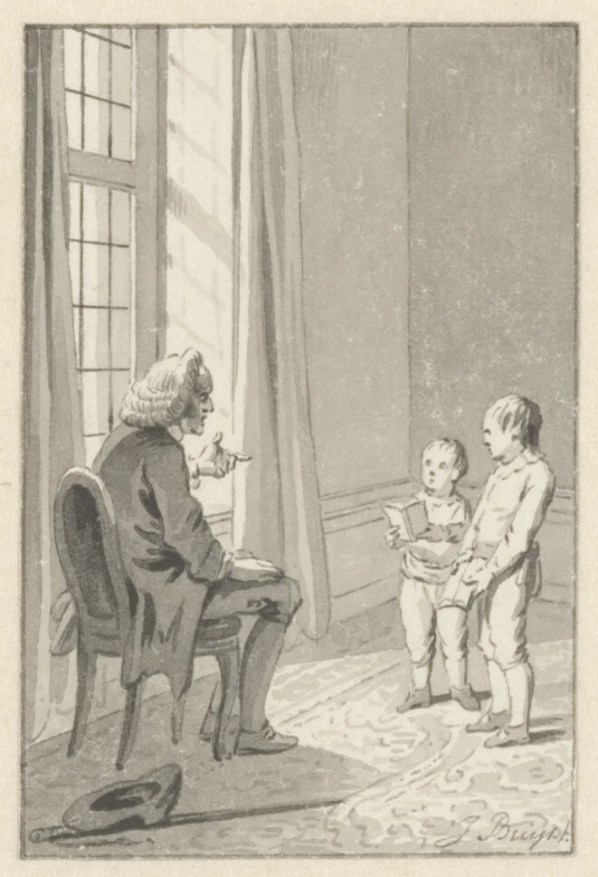 Veiling Cornelis van Stroo, Alkmaar, 29 juli 1811 e.v.d., Kunstboek P: 'Inhoudende 44 stuks Teekeningen, met den Titel; allen met de Pen en O.I. inkt door Jacobus Buys behorende tot de Kindergedichten van J. van Alphen' en 'Ook nog 24 stuks Teekeningen tot onderscheidene Werken behoorende, allen met O.I. inkt door zoo Evengemelde Meester [Jacobus Buys].';Aankoop 1985 (van E.H. Ariëns Kappers, Amsterdam, zogenaamd als afkomstig uit de collectie van Cornelis Schoon (1719-1778), Broek in Waterland, gehuwd met Neeltje Pater)