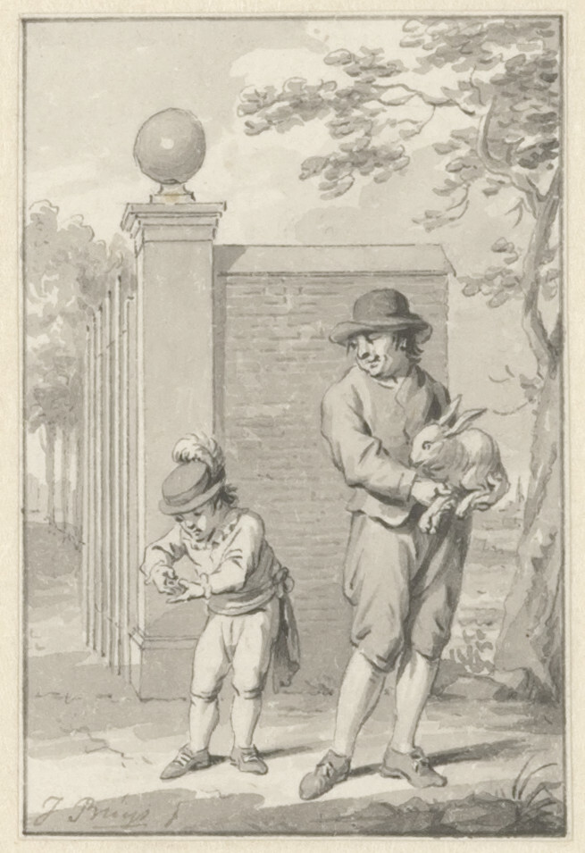 Veiling Cornelis van Stroo, Alkmaar, 29 juli 1811 e.v.d., Kunstboek P: 'Inhoudende 44 stuks Teekeningen, met den Titel; allen met de Pen en O.I. inkt door Jacobus Buys behorende tot de Kindergedichten van J. van Alphen' en 'Ook nog 24 stuks Teekeningen tot onderscheidene Werken behoorende, allen met O.I. inkt door zoo Evengemelde Meester [Jacobus Buys].';Aankoop 1985 (van E.H. Ariëns Kappers, Amsterdam, zogenaamd als afkomstig uit de collectie van Cornelis Schoon (1719-1778), Broek in Waterland, gehuwd met Neeltje Pater)