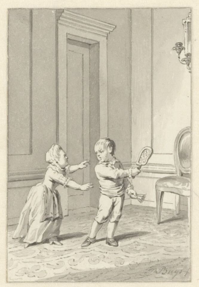 Veiling Cornelis van Stroo, Alkmaar, 29 juli 1811 e.v.d., Kunstboek P: 'Inhoudende 44 stuks Teekeningen, met den Titel; allen met de Pen en O.I. inkt door Jacobus Buys behorende tot de Kindergedichten van J. van Alphen' en 'Ook nog 24 stuks Teekeningen tot onderscheidene Werken behoorende, allen met O.I. inkt door zoo Evengemelde Meester [Jacobus Buys].';Aankoop 1985 (van E.H. Ariëns Kappers, Amsterdam, zogenaamd als afkomstig uit de collectie van Cornelis Schoon (1719-1778), Broek in Waterland, gehuwd met Neeltje Pater)