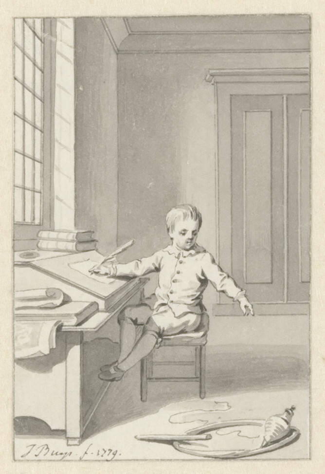 Veiling Cornelis van Stroo, Alkmaar, 29 juli 1811 e.v.d., Kunstboek P: 'Inhoudende 44 stuks Teekeningen, met den Titel; allen met de Pen en O.I. inkt door Jacobus Buys behorende tot de Kindergedichten van J. van Alphen' en 'Ook nog 24 stuks Teekeningen tot onderscheidene Werken behoorende, allen met O.I. inkt door zoo Evengemelde Meester [Jacobus Buys].';Aankoop 1985 (van E.H. Ariëns Kappers, Amsterdam, zogenaamd als afkomstig uit de collectie van Cornelis Schoon (1719-1778), Broek in Waterland, gehuwd met Neeltje Pater)