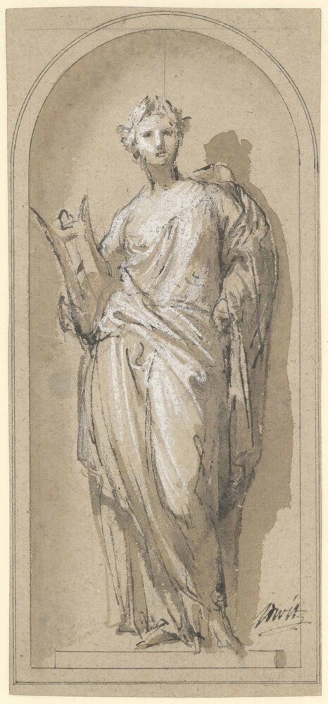 Deze tekening is een ontwerp voor een in grisaille geschilderde decoratie op de deur van een kunstkast (afb. a), zoals er zich een in de collectie van het AHM bevindt. Twee tekeningen met allegorische figuren (afb. b en c), die zich in Brussel bevinden, zijn zowel in tekenstijl als in compositie nauw verwant aan het Amsterdamse blad. De twee bladen verbeelden Poesia en Pictura. Het Brusselse blad met Pictura is een voorstudie voor een grisaille op een kunstkast, die in het bezit is geweest van de verzamelaar Cornelis Ploos van Amstel. De Brusselse Poesia is vrijwel identiek aan de Amsterdamse Erato. Beiden leunen op het rechterbeen, het hoofd met lauwerkrans is en face weergegeven en de gewaden zijn op vergelijkbare wijze gedrapeerd. Alleen de attributen verschillen: respectievelijk een trompet en een lier. ( Leonoor van Oosterzee)