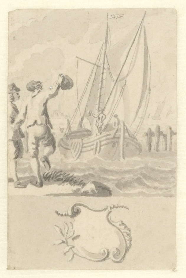Ontwerpen voor de zestig kaartjes van een loterij spel (Water met zeilboot en wuivende mannen), 1740 - 1760 Amsterdam papier, potlood, waterverf hoogte: 7.5 cm; breedte: 4.9 cm; opschrift verso: 12