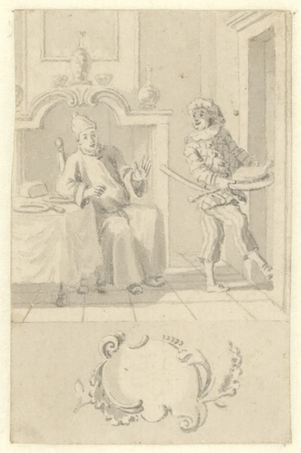 Ontwerpen voor de zestig kaartjes van een loterij spel (Interier met een man aan tafel en een bediende in harlekijnskostuum), 1740 - 1760 Amsterdam papier, potlood, waterverf hoogte: 7.5 cm; breedte: 4.9 cm; opschrift verso: 18
