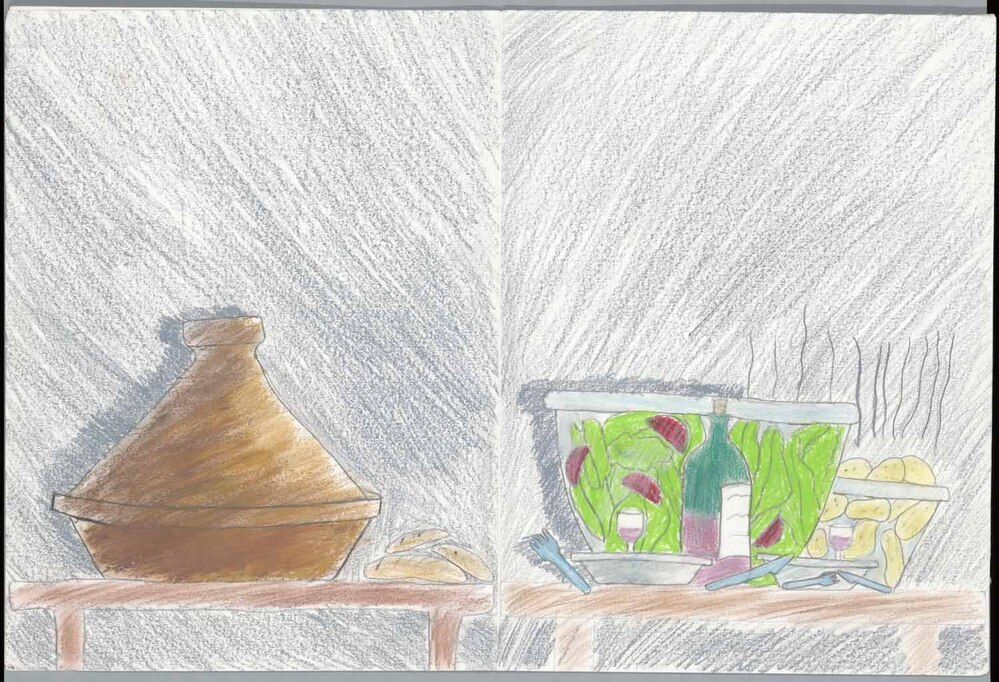 Tweeluik. Links een Marokkaanse maaltijd, rechts een Nederlandse. Op karton geplakt.- Trefwoorden