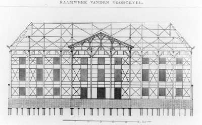 - Raamwerk van de voorgevel uit de serie: afbeeldingen van den schouwburg te Amsterdam, 1774