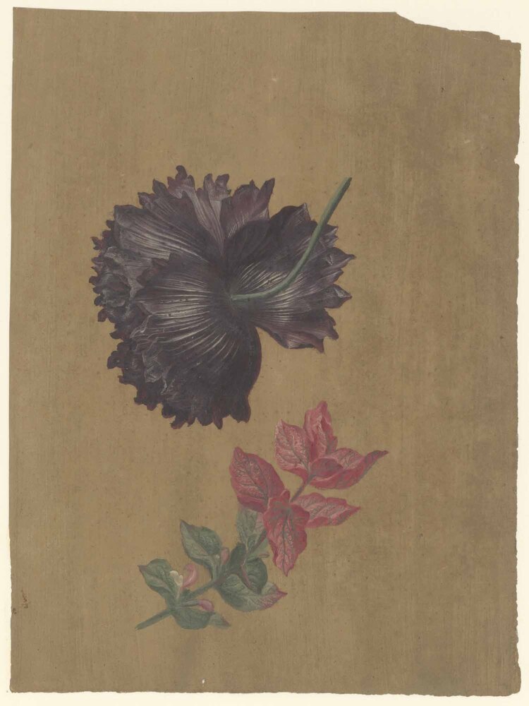 Deze losse bloemenstudies van Catharina Backer zijn waarschijnlijk net als de tekeningen in het album omstreeks 1710-1712 ontstaan. De amateur-kunstenares schilderde verschillende bloemensoorten, waarvan de weelderige koolroos haar favoriet was. Het is niet met zekerheid te zeggen of en bij wie Catharina schilder- en tekenlessen nam. Jan en Jacob van Huysum worden wel genoemd als haar mogelijke leermeesters, evenals Rachel Ruys. ( Bert Vreeken)
